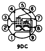 Heater Voltage 6.3 V Heater Current 0.45 A Maximum Heater-Cathode Voltage Heater Positive with Respect to Cathode DC Component 100 V Heater Negative with Respect to Cathode DC Component 100 V Direct Interelectrode Capacitances (approx) Pentode Input 5.5 pf Output 3.8 pf Grid to Plate 0.025 pf Triode Input 2.5 pf Output 1.8 pf Grid to Plate 1.5 pf Maximum Ratings (Design Center Values) Pentode Plate Voltage 250 V Grid No. 2 Voltage 175 V Plate Dissipation 1.7 W Grid No. 2 Dissipation 0.5 W Cathode Current 14 mA Grid No. 1 Circuit Resistance Fixed Bias 0.5M ohm Self Bias 1M ohm Triode Plate Voltage 250 V Plate Dissipation 1.5 W Cathode Current 14 mA Grid No. 1 Circuit Resistance Fixed Bias 0.5M ohm Self Bias 0.5M ohm Characteristics and Typical Operation Triode Class A Amplifier Plate Voltage 100 V Grid No. 1 Voltage -2 V Amplification Factor 20 Transconductance 5000 µ Plate Current 14 mA Pentode Class A Amplifier Plate Voltage 170 V Grid No. 2 Voltage 170 V Grid No. 1 Voltage -2 V Plate Resistance (approx) 400K ohm Transconductance 6200 µ Plate Current 10 mA Grid No. 2 Current 2.8 mA