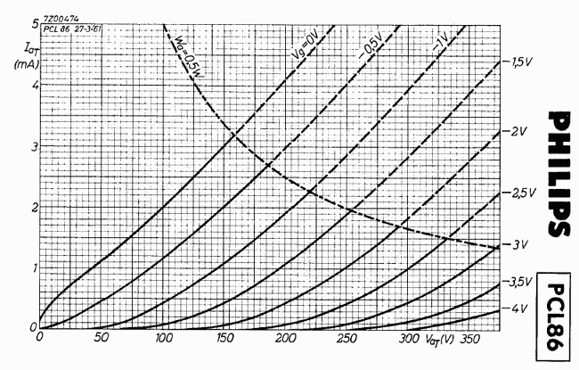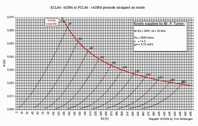 Pentode Plate Voltage ................................. 300 Volts Grid No. 2 Voltage ............................ 300 Volts Plate Dissipation ............................. 9 Watts Grid No. 2 Dissipation ........................ 1.5 Watts Pentode Class A Amplifier Plate Voltage ................................. 250 Volts Grid No. 2 Voltage ............................ 250 Volts Grid No. 1 Voltage ............................ -7 Volts mu ............................................ 21 Plate Resistance (approx) ..................... 45K Ohms Transconductance .............................. 10000 MicroMhos (10mA/V) Plate Current (Zero Signal) ................... 36 Ma. Grid No. 2 Current (Zero Signal) .............. 6 Ma. Triode Class A Amplifier Plate Voltage ................................. 250 Volts Grid No. 1 Voltage ............................ -1.9 Volts mu ............................................ 100 Transconductance .............................. 1600 MicroMhos (1.6mA/V) Plate Current (Zero Signal) ................... 1.2 Ma. Vh = 6.3 Volts (6GW8 and ECL86 only) Ih = 660 Ma Vh-k = 100Vpk Vh = 14.5 Volts (PCL86 only) Ih = 300 mA Maximum (limiting) ratings Plate supply ............ 550 V Plate voltage ........... 300 V G2 supply ............... 550 V G2 voltage .............. 300 V Cathode current (avg) ... 4 mA (T), 55 mA (P) G2 input ................ 1.8 W (3.25 Wpk) Plate dissipation ....... 0.5 W (T), 9 W (P) G1 circuit R (max) ...... 1M (T), 500K (P)The capacitance between triode grid and pentode anode (CgT-aP) can be reduced to a value of less than 0.002pF by using a shielding ring with a diameter of 22.5 mm and a height of 15 mm with respect to the tube base.