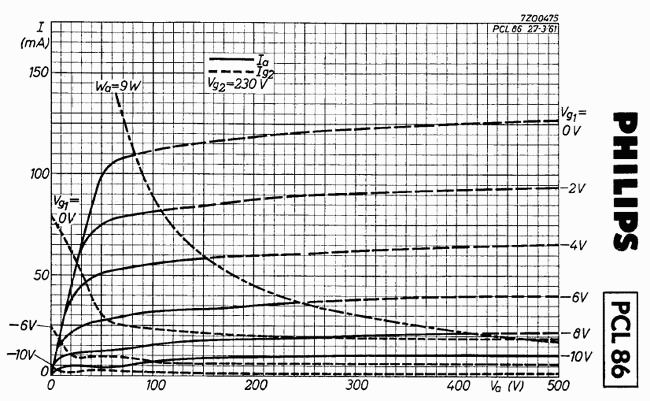 Supply voltage Vb 250 250 250 300 300 300 Volts Common cathode resistor Rk 90 90 90 130 130 130 ohm Load resistance Ra-a~ 8.2 8.2 8.2 9.1 9.1 9.1 Kohm Grid 1 drive Vi 0 0.24 5.5 0 0.26 8.4 Rrms Anode current Ia 2x32.5 - 2x35.5 2x31 - 2x36.5 mA Grid 2 current Ig2 2x5.6 - 2x8.9 2x5.5 - 2x11 mA Output power Wo 0 0.05 10 0 0.05 13.6 W Distortion dtot - 0.4 5.0 - 0.4 4.0 % Characteristic curves for pentode, triode-strapped pentode, and the triode section. (about 50k gif each) Source: jk1eyp (in Japanese, go via Google for “translation”)