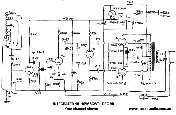 Notes: screens Ultra-Linear connected; MJE340 is a commonly available high voltage transistor used here as a capacitance multiplier (the 100uF on the base is multiplied by the transistor hFE or gain). Each cathode bypass is 2,200uF for extended (hi-fi) bass. The RC “snubbers” on the transformer windings may require tweeking for individual output transformers, also the 0.002uF in the Voltage NFB loop. Vsup = 330V, RL = 12k p-p, Pout = 10W (hi-fi).