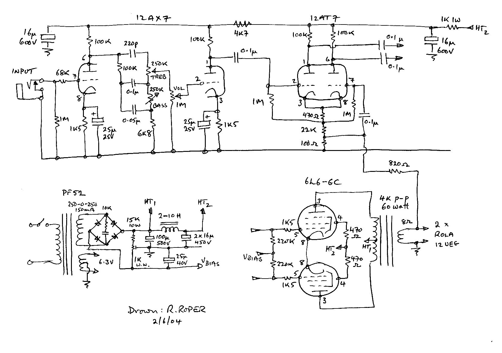 Circuit of a simple amp using a Fender two-knob tonestack and a pair of 6L6's. This uses an unconventional bias supply using a divider across the main HT supply. This works but is wasteful and not very satisfactory at higher powers like this.