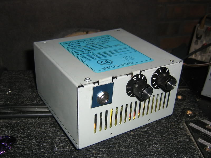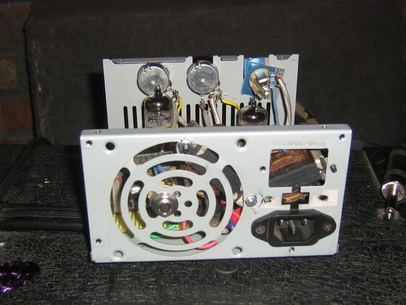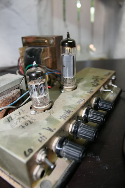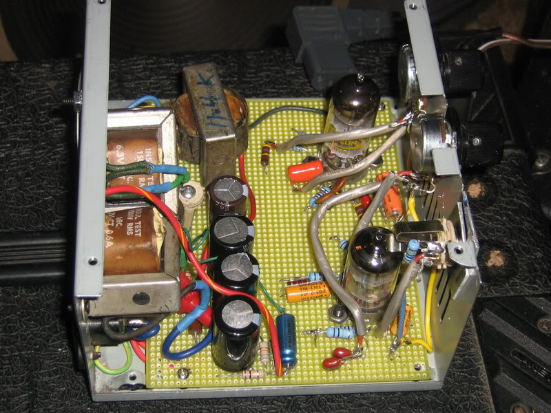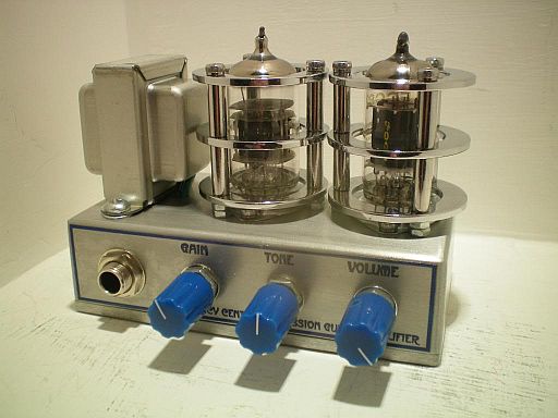 A pleasing micro guitar amp. This shows how to build nice looking valve protection towers out of washers (possibly from the bathroom hardware department) and some standard standoffs and bolts.
