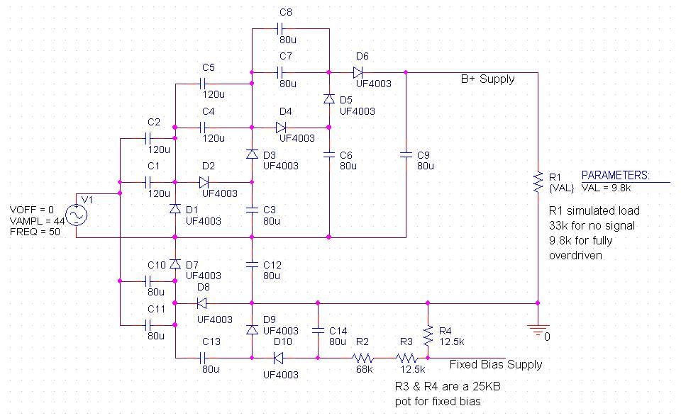 Expanding on the quadrupler, I had an idea about a HT supply for fixed bias push-pull. If you add another doubling stage on the grounded end of a quadrupler or octupler circuit with the standard resistive divider and pot it will generate a negative voltage for a fixed bias supply. I simulated this in Orcad and it seems to work fine. The bias supply is lightly loaded and doesn’t seem to upset or unbalance the quadrupler or octupler circuit.