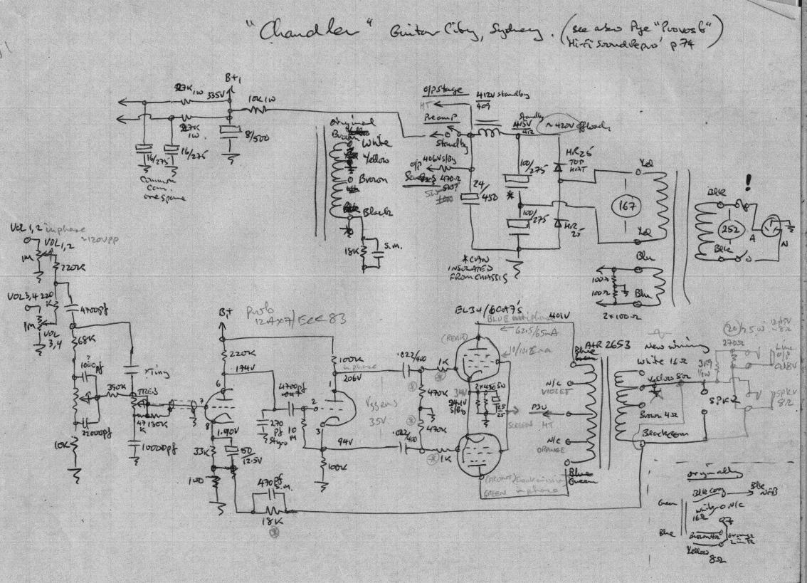 No surprises here (unless you happened to touch the uninsulated can of one of the electros in the HT voltage doubler! - naughty, naughty). A very conventional arrangement including passive Baxandall tone controls. Tremolo cathode coupled to an early preamp stage. Two EL34/6CA7's in cathode bias.