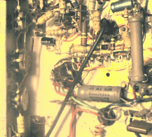 Another feature is the ability to run from a car battery, also found in many AWA PA's of the era. The can at rear-left is a vibrator, basicallly a fancy buzzer, arranged to switch incoming 12 (or 6) volts into a winding on the mains tranny.