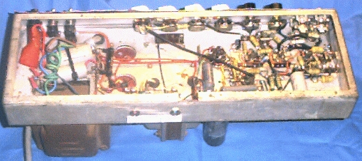 From the pix we appear to have a couple of rectifiers, 6V6 push-pull output, driven by 6SJ7 pentodes. Note that the input pentode is on a floating shock-mounting base.