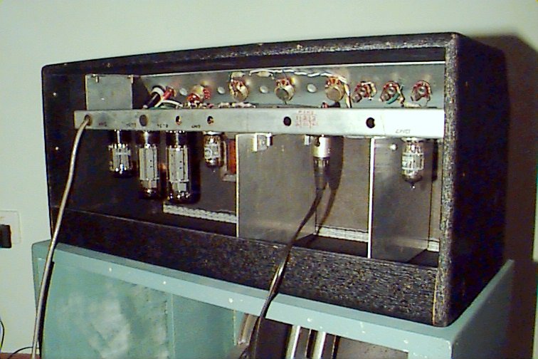 Note unused chassis holes, and pot-case “ground”.The tone stack appears to be between V1b and V2a, with V2 being a 12AX7 in long tail pair Schmidt configuration.