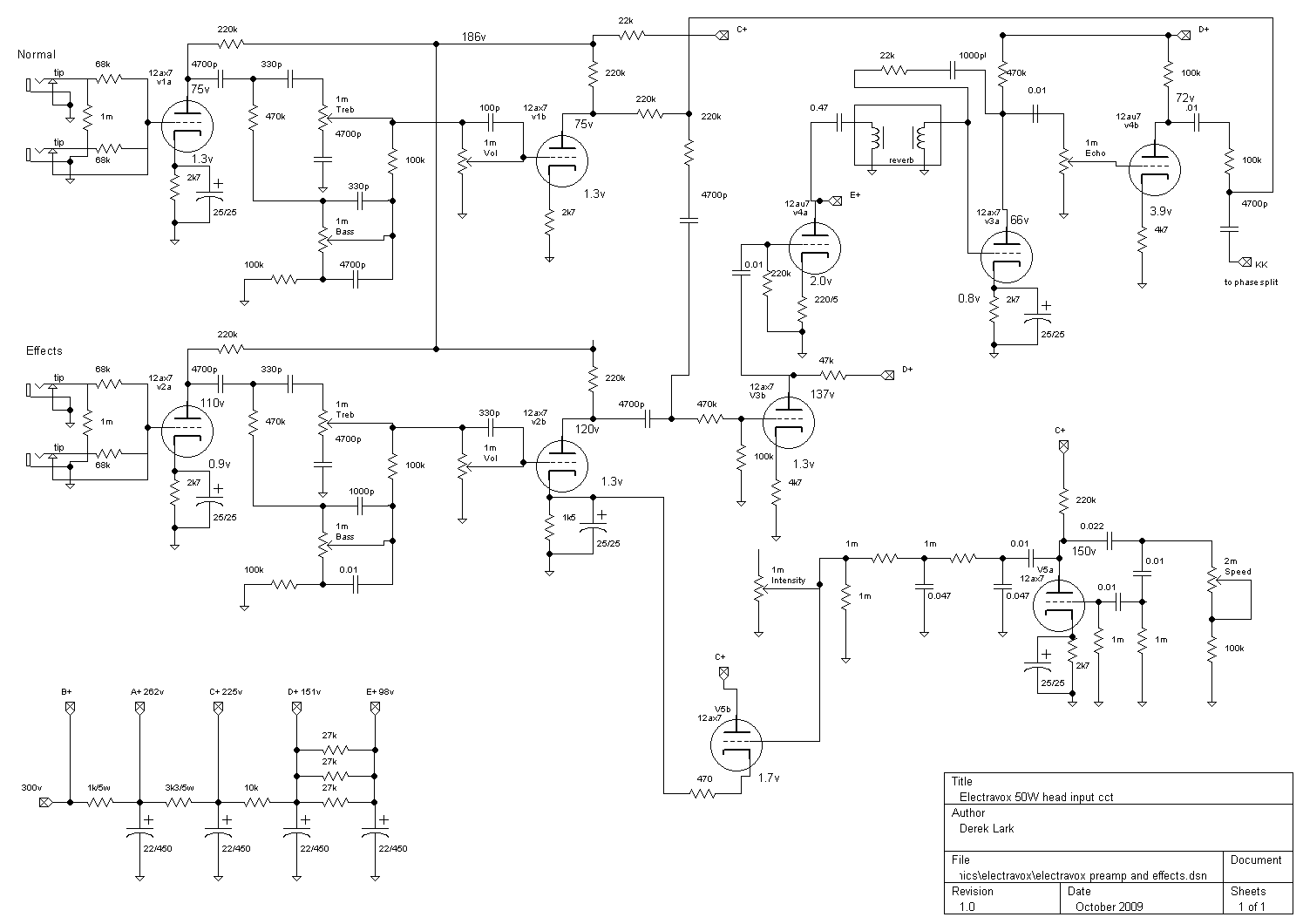 Derek Lark has sent in a preamp and effects circuit tracing for an Electravox 50 head.
