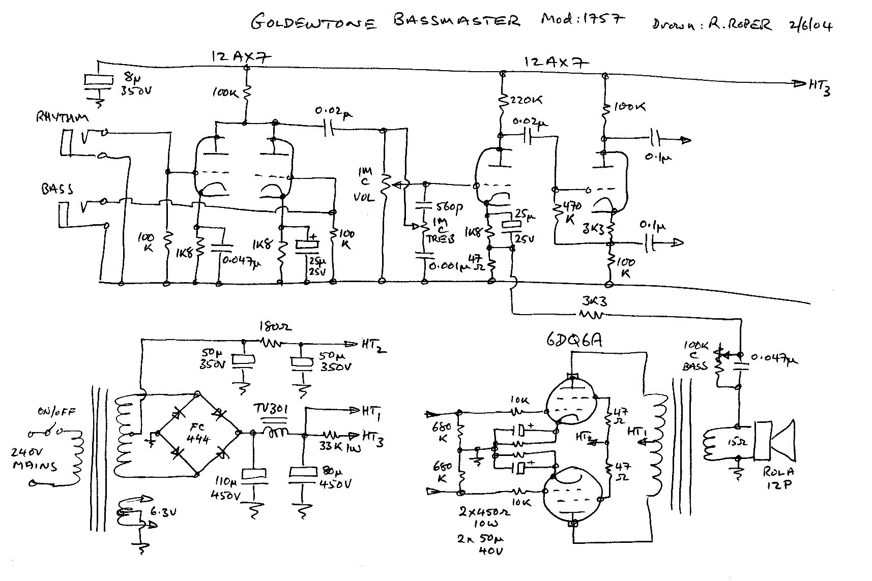 Circuit for 60's single 6GW8 1x8-inch combo, thanks to J.Mumford and C.Lilly.