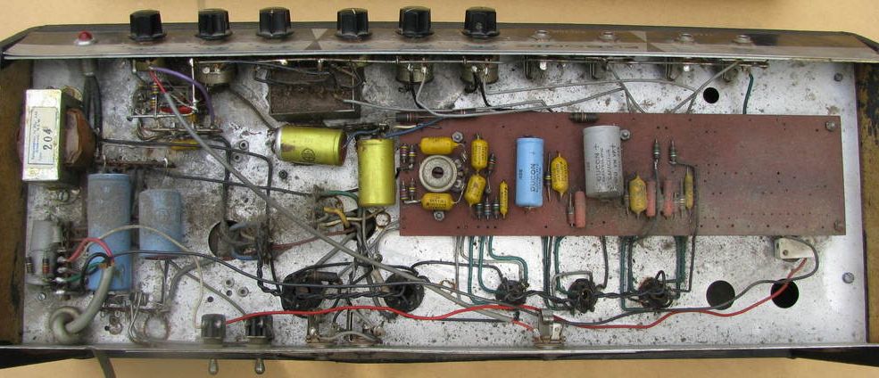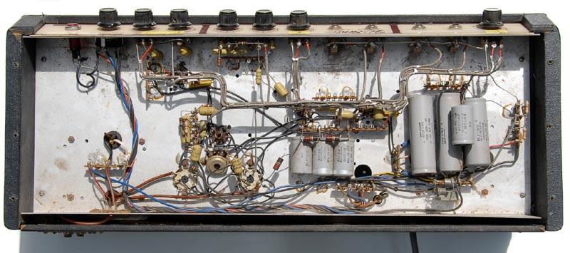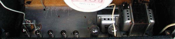 At left 6GW8 and reverb spring line drive transformer; four preamp valves including phase splitter; twin 6L6's.