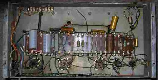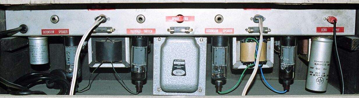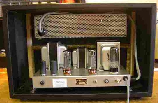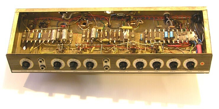 It has two complete amplifiers each using a pair of 6CM5's rather than the normal 6DQ6's. These are arranged with a reverb tank to provide so-called foldback reverb where the second channel is used to amplify the reverb output.
