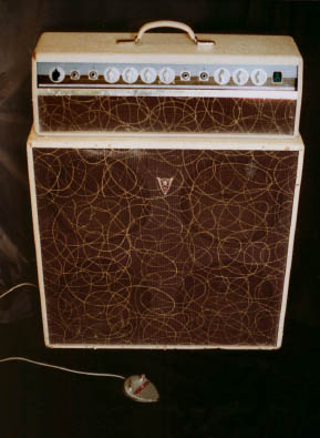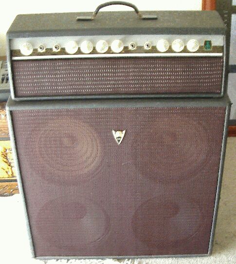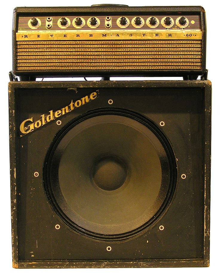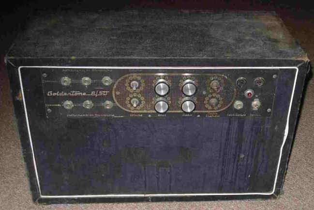This head and box combination is truly awesome. The speaker grille cloth has long vanished from the front of the cab, but the remainder of it can still be seen inside the front baffle - definitely genuine Goldentone.