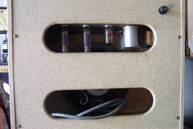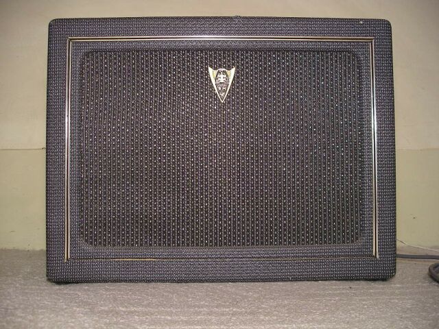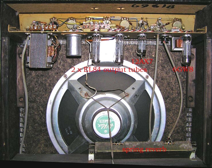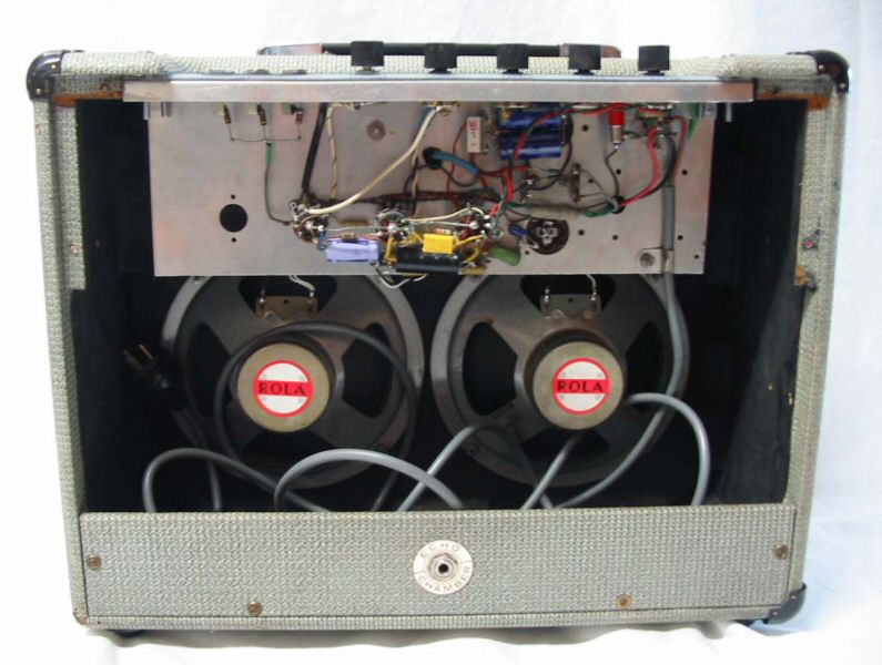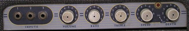 Tubes are 6GW8s and 12AX7. 3 Inputs Volume, Bass and Treble Plexiglass Top Panel Valve Tremolo with Speed and Depth Controls 2 x 8-inch Vintage Rola Speakers Ultra-Cool Creme Tolex with Black and Gold Swirl Grille ClothSource: MelmusicThe 'echo chamber' socket at the bottom is unlikely to be a Tip Ring Sleeve (TRS or 'stereo') since stereo wasn't common yet, but possible as TRS connectors had long been used in telephone service while uncommon in audio.