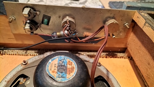 I really don't know how old this amp is. My guess is 1950s. Fitted with a Rola speaker and 6GW8 Hitachi valve, it sounds smooth and rich - and overdrives with a very sweet purr.