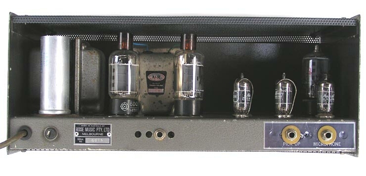 This unit is a fine performer of the 1960s, supplying standard 6mm jacks for Rhythm or Lead Guitars, plus a Microphone input. The unit has two stages of Pre-Amp, using separate triode sections from two of the 12AX7's, each having their own input control from the front panel. A 12AX7 is also used for the phase splitter. A nice combination unit. This is truly another of the gems from the 60s.