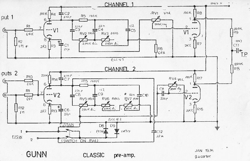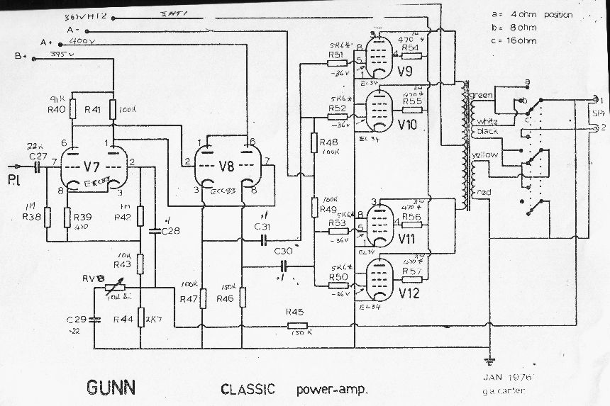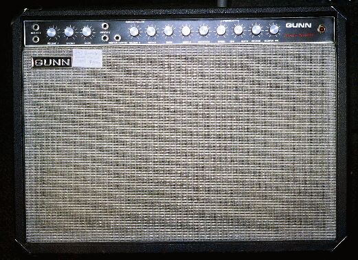 The amp I tested used 3 x ECC83, 1 x ECC82, and 4 x EL34 output valves. The power amp circuit is similar to some 200 watt Marshall types. The two channel amp had simple tone controls on channel one and Marshall type tone controls with a simple foot switchable gain boost on channel two. Gunn made a variety of 50 and 100 watt amplifiers, some in combos.