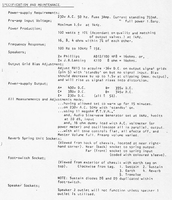 Price Paid: a few hundred dollars NZ used 50w all-tube amplifier, probably in the 70's. Around 25-30 years old. Large, about a metre and a half long and fairly hefty. Two channels (each with twin inputs) each with separate volume knob, Channel 1 has a blunter, low-end feel to it, would suit a bass guitar. Channel 2 is more high gain, with a crisper, treble tone. Treble/mids/bass and presence control, Power and standby switch. Two speaker outputs (one primary, one secondary) 16,8 or 4 ohms. Submitted by Ben Lane at 02/01/2004 13:46 Source: Harmony-Central --- Price paid: $22 2 channel, 2 (what looks like) GEC KT66s. From: Brad/Matt Parker Thu Dec 13, 2001 Source: ANZamps