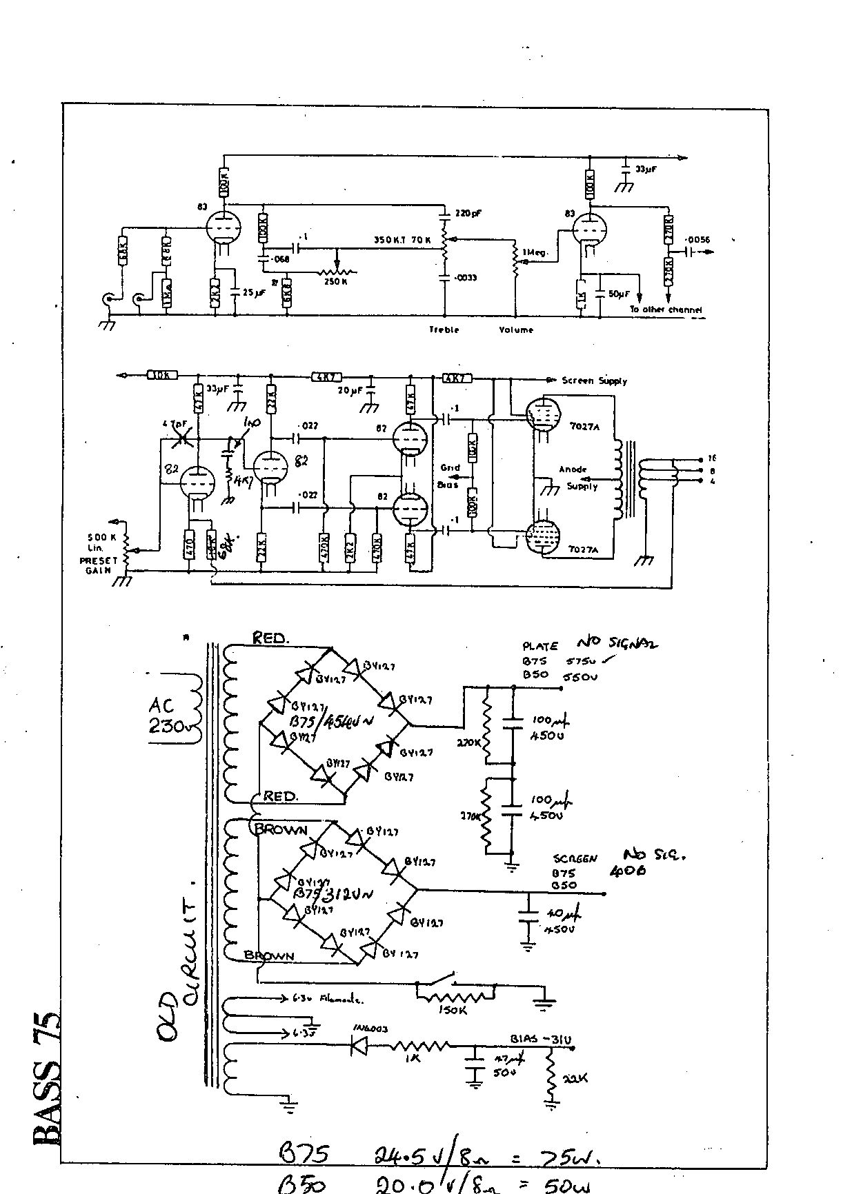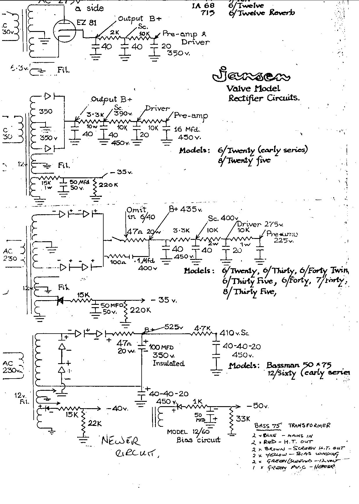 Price Paid: 350 (NZD) used two channels, each with two inputs. Each channel has a volume, a bass and a treble dial, on the back panel of the amp is a master volume control. designed for 7027A valves, but I have sovtek 5881s in it. Submitted by tod robertson --- Price Paid: N/A The JANSEN Bass 75 is a more powerful version of the Bass 50. The circuitry is identical but the 75 should have 7027A valves in it not the 6L6. The two preamp must be ECC83 (12AX7) and the phase splitter/driver tubes must be ECC82. Any variation will cause problems. Especially if the preamp tubes are mixed. A common cathode resistor is used for the second triodes of each tube so one channel will end up not working. Wrong tubes in the driver stages will cause distortion and loss of power. Many other models include: 6/12Reverb, 6/40Twin, 6/35, 6/40, 7/40, 8/35, 8/50, 12/60, 12/100, some included Tremolo and reverb. Jansen is still getting a steady stream of these amplifiers for service and repair which reflects their popularity and reliability. The Bass 75 and Bass 50 have a preset Master Gain on the rear panel. I'm the guy who has been servicing the amps at JANSEN for years. john@jansen.co.nz I started with Jansen in 1969 until 1972. Rejoined in 1978 and still here. I will pledge to do my best for all JANSEN owners in servicing and repairing all models made between 1959 to 1999. Source: John Veldwijk --- Price Paid: $450 (NZD (1=0.42US)) used Built: May 77 75 watt Primarily designed for bass but I use it for guitar after changing a resistor value to increase gain. 2 independent channels with two inputs each (i.e. 4 inputs total). Each channel has bass, treble and volume control. Adjustable 4/8/16 ohm main and extension speaker out. ECC83 for each channel both feed into two ECC82s dual 7027A's in push pull config. The amp is also designed to take high rated 6L6GCs. Has standby. Amp goes to 2X12-inch cab. Submitted by Anonymous at 05/25/2001 00:39 Source: Harmony-Central
