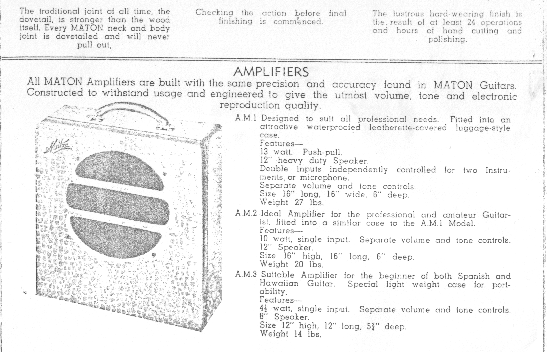 The AM series of amplifiers are believed to be the first of the Maton amps. These amps were often sold in combination with lap steel guitars.