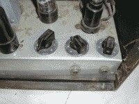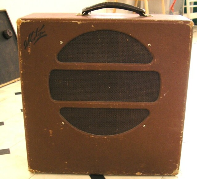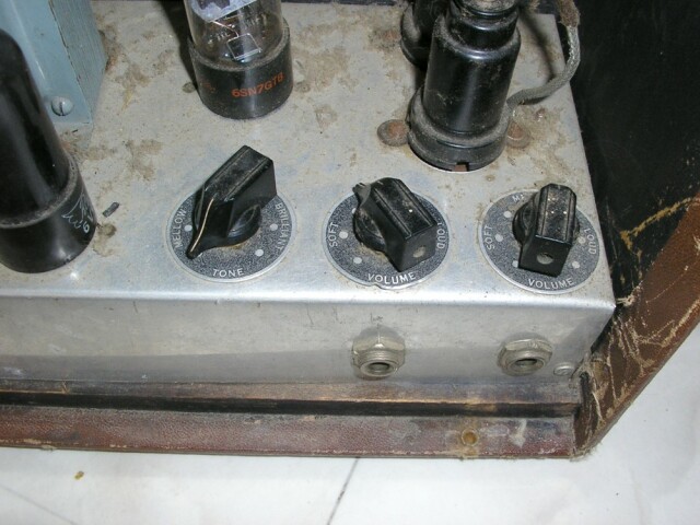 While it is unbranded I've put this one under Maton because the serial number stamping is typical of a Maton. Although I have some doubts that Maton were building amps that far back it certainly looks right for 1947 vintage, speaker, valve can, electrolytic caps, pots, waxed paper caps, “body-end-dot” coded resistors, cotton-covered rubber insulated mains lead.