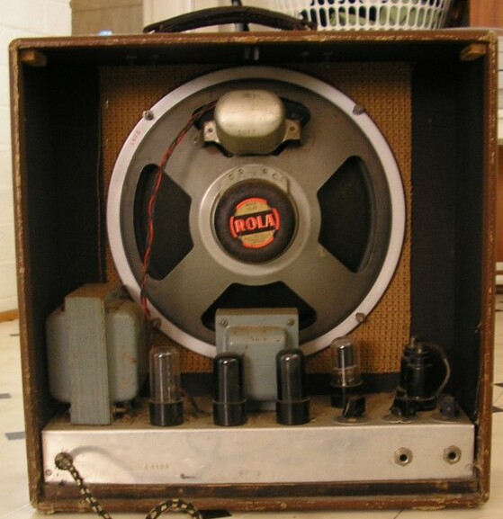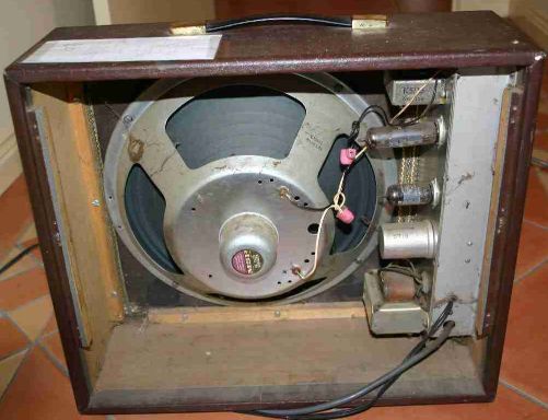 5Y3 rectifier left next to the power transformer. Single ended Class-A output stage I'd guess a 6L6 (and maybe should be a 6V6?), output tranny on the speaker above. The preamp is at right, grid on the top cap, probably a pentode I'll guess is a 6SJ7 like the AM-1.