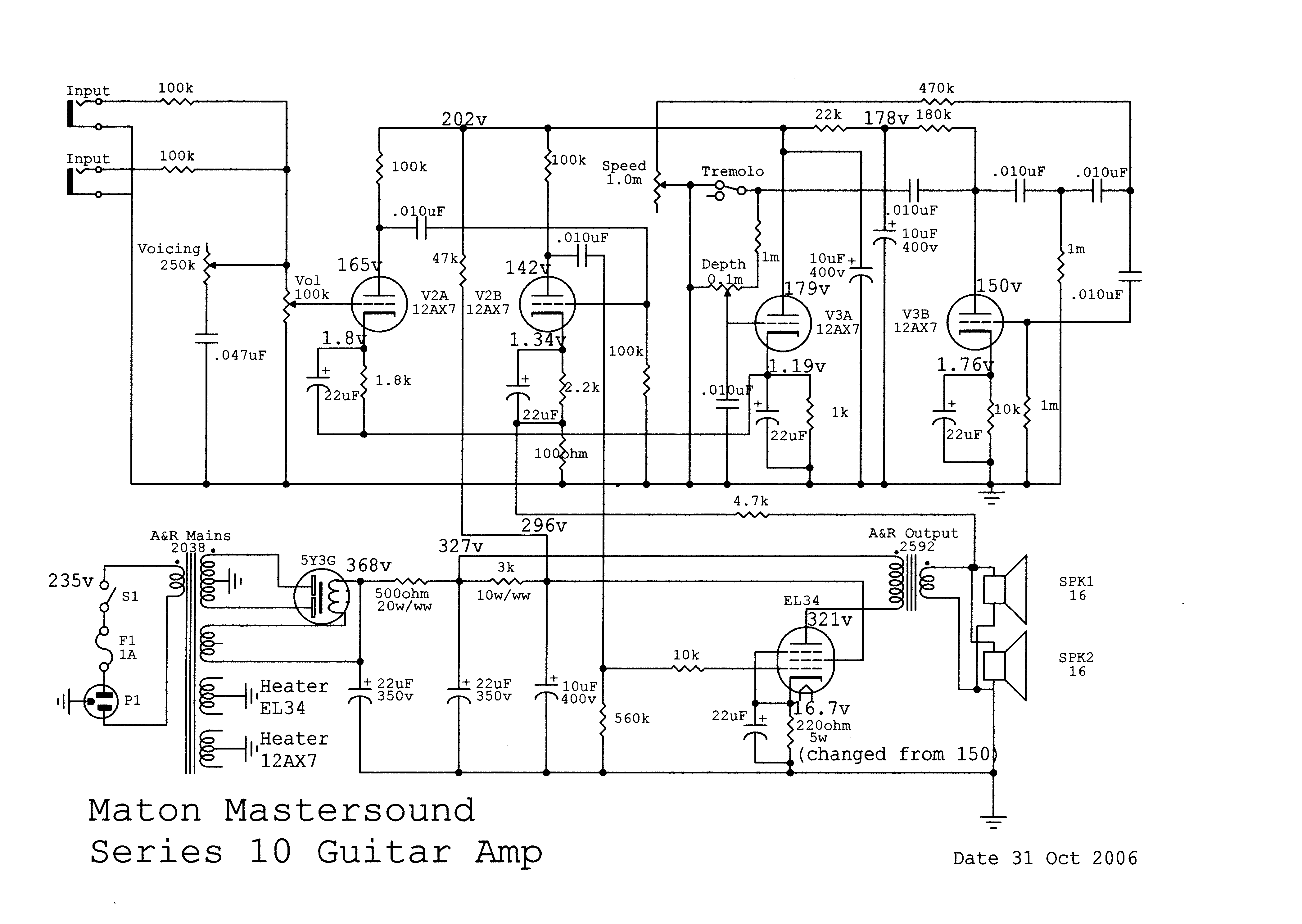 Note: thanks to Ric's considerable efforts this drawing corrects a number of details on the original (undated). If you have the previous undated version please download this corrected version and delete the old one.In Ric's amp the cathode resistor for V3A (tremolo injection) was 8k2. This was clearly wrong, biassing the preamp section V2A off. Reducing this to 1k has restored proper operation, but until someone else has a look under their Mastersound-10 and tells us what the correct value is, it remains a mystery.
