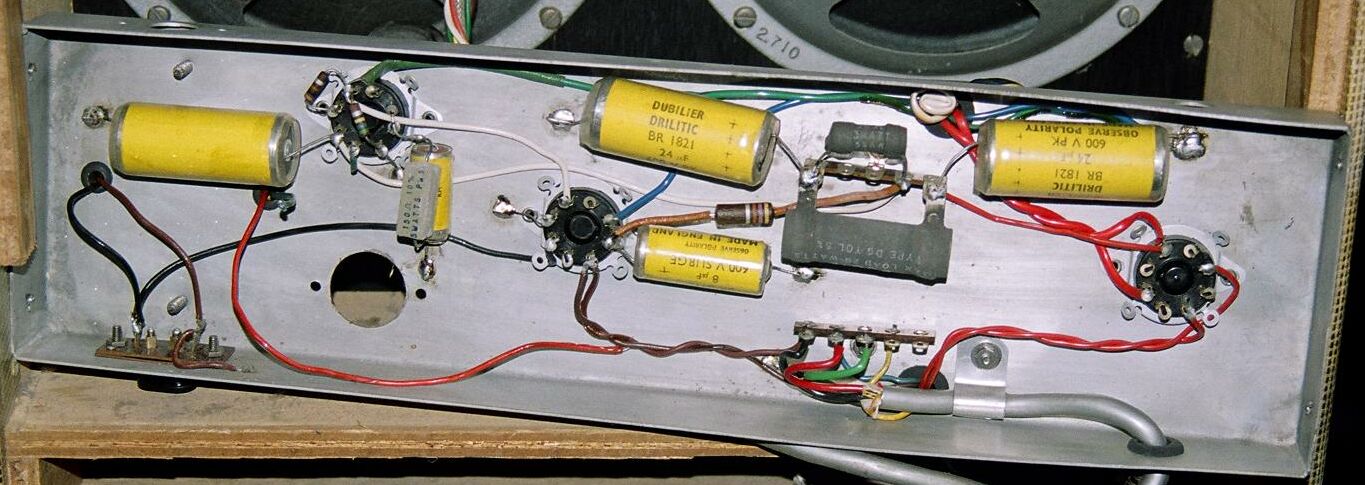 It's got 2 large and two small valves/ tubes. The large valves are 6DQ5As or 6DQ5Bs [*] which would put it at about 40-50 watts. The small ones are 12AX7's, and one is for the preamp. I'm told by an experienced ebayer that the valves are the type used in Moodys, Goldentones, Rose Morris amps and several other Australian types like kit-built playmasters. They are very rugged sweep tubes used to dive TV sets.