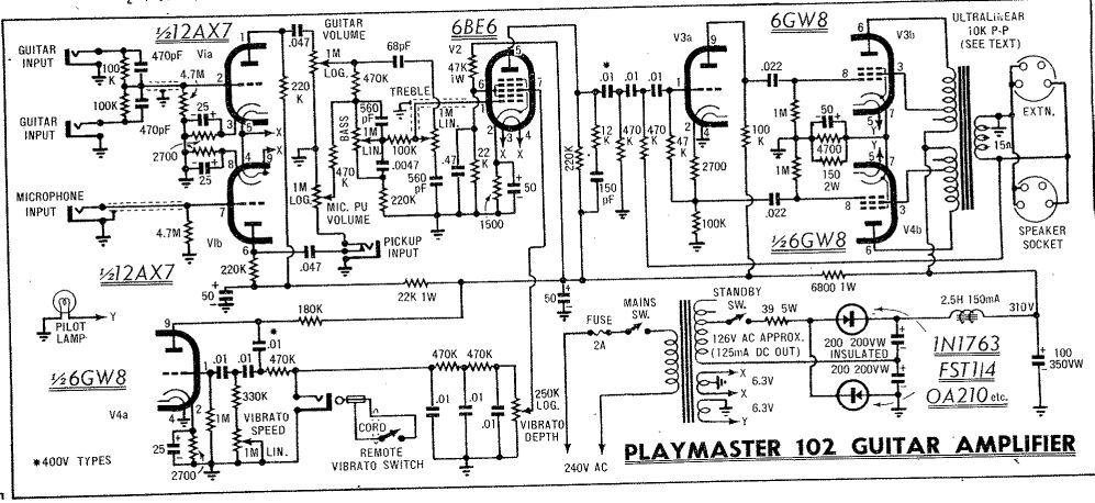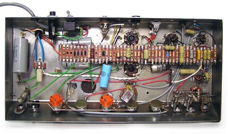 Two pairs of 6GW8's in ultralinear connection (possibly unique in guitar amps), 7199 triode-pentode as preamp and reverb recovery, and the “notoriously” unique 6BE6 pentagrid mixer as pre and tremolo mixer. (Well? There were lots of Radio Shops around in those days - it made good sense then - now we'd use the neon/LDR arrangement from the PM116/7, or even (gasp) solid-state.)