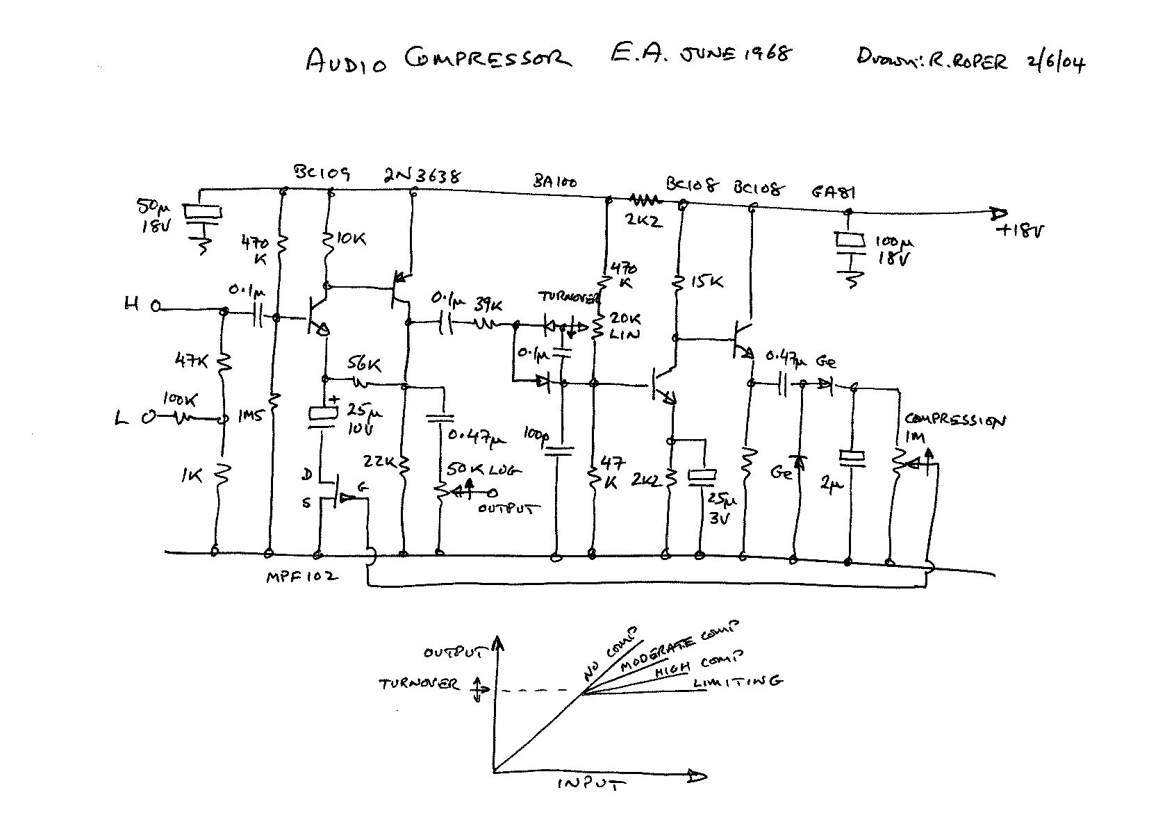 This control voltage is fed back via the compression control to the gate of the FET which is used as a variable resistance in the local negative feedback on the amplifier.