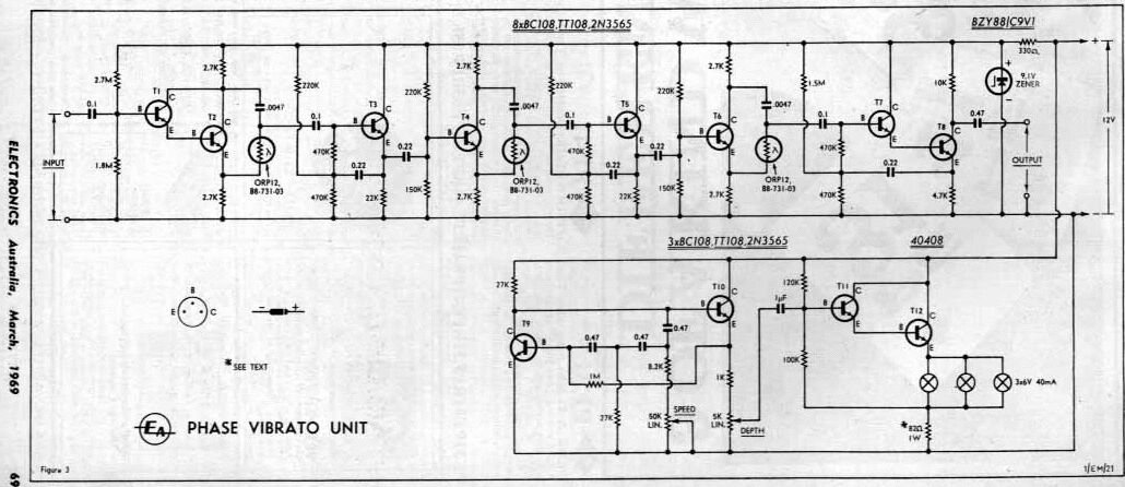 Points of note are that this is very similar to many of the “phaser” pedals that followed but makes use of bi-phase drive to each LDR, however the input is not mixed with the phase-shifted output so no frequency selective “picket-fence” cancellation occurs.