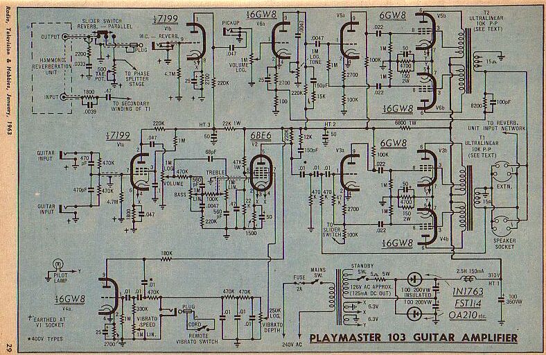 The circuit for the Playmaster 103 is in their black-on-blue period (which followed their traditional white-on-blue). (150kb jpg) Thanks to Joe “Amp Mangler”.
