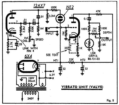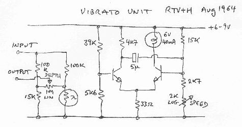 The signal section is taken from the earlier valve vibrato unit (shown above), but the oscillator is more digital and depends on the lag of the bulb and LDR to soften the modulation.