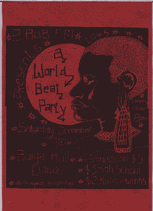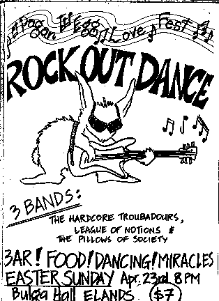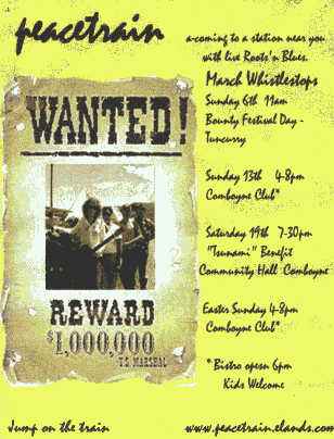 Gig outcome: success. The simple line drawing of Wok out Wabbit tells it all at a glance. Gig outcome: failure. A lovely artwork, but lost on dark red, too busy and more suited to a greeting card. These two are hand done, but just because a computer can produce a neat-looking colour end product easily, don't assume that means you know what you're doing, or your poster will automatically work.