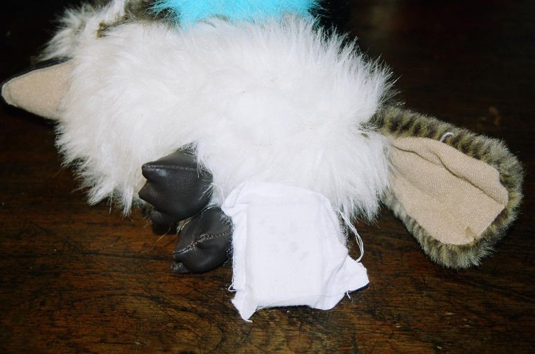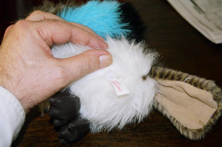This will lead you in through all the fur to the seam, and it's a pretty fair bet this was how the voice box was inserted towards the end of production.