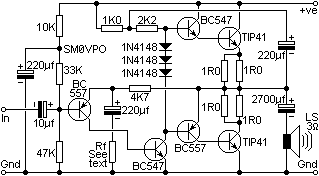 In the previous examples the output pair was driven by the VAS (Voltage Amplifier Stage), but as power levels go up so do drive requirements, thus in this 4-watt amp we introduce a medium-power driver stage (almost always a complimentary pair, such as the BD139/140, here a BC547/557). We also now have three forward diode drops, so a third diode is added to the bias string to compensate.