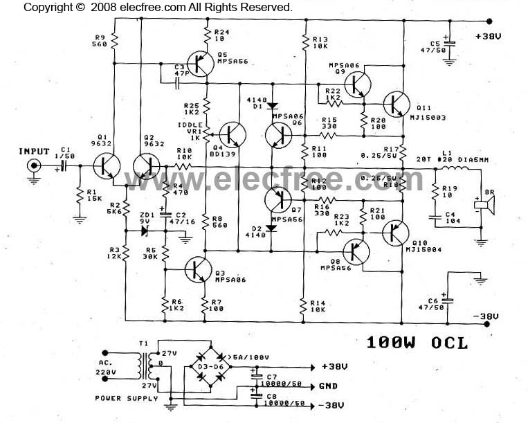 Now we get pretty serious with a 100 watt design. Q1 and Q2 form a proper NPN differential input amp, input to one side and both DC and AC NFB to the other. The VAS, Q5, has a constant-current load, Q3, rather than just a bootstrapped resistor, and the thermal compensation is being done by a single forward-biassed transistor, Q4.