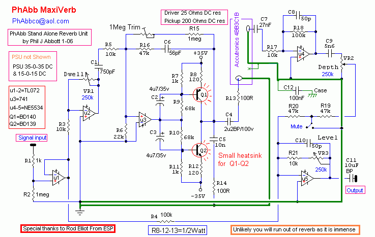 Phil Abbott has been kind (brave? stupid?) enough to submit a circuit for a spring-line reverb unit he designed and built. He has dubbed it the MaxiVerb because it's “immense”.