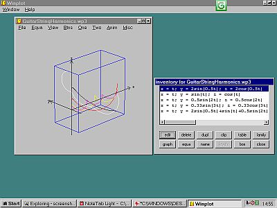3D mode - the actual shape (white) of a string supporting a number of helical sinewaves. Note that I have to express each sinewave in the math form;