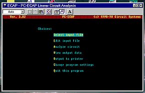 PC-ECAP is an easy to use AC circuit analysis program which analyzes circuits consisting of resistors, capacitors, inductors, transformers, transmission lines, transistors (both bipolar and FET's), operational amplifiers and transconductance amplifiers.