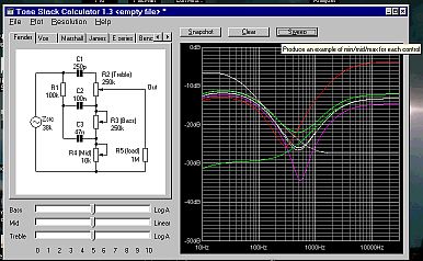 This programme only models a pre-set range of tonestack circuits (Fender, Vox, Marshall, James, E-Series, Bench, BigMuff; you can't enter your own circuit as in EWB or Spice), but within that limitation you can change everything significant about the components; and it does this limited job very well indeed. You can rewire to a very limited extent by setting components to open or short values. A lovely little tool/plaything.