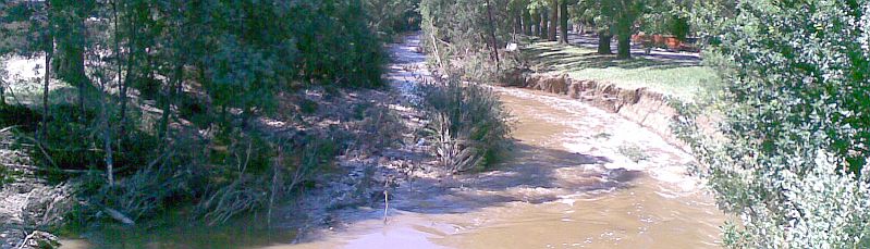 This volume implies an upper velocity of (294/36) or over 8m/s, however best practice calls for a maximum water velocity of 2-2.5m/s to prevent damage to the structures. In practical terms this limitation sets an upper capacity for the channel of around 100m3/s for a 3m/s flow (and the erosion at Hammon Park is an object example of how much damage even 3m/s can do in a few hours).