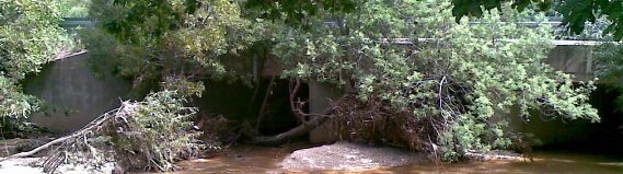 Compared to anywhere else along the creekline through town, these two bridges stand out at the major impediment to creek flow by a large margin, a factor of two or three times.