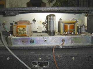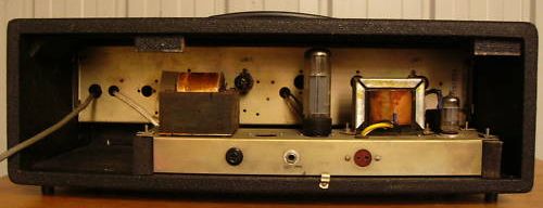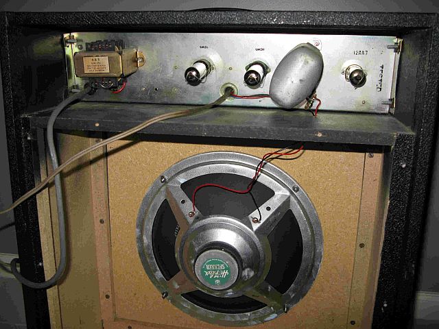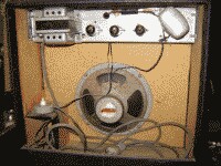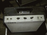 Source: Harmony-Centralserial number 483 Single channel two inputs marked "Instrument 1" and "Instrument 2" volume, bass, treble and a "tremelow speed" a very primitive looking footswitch I'm assuming it's 10 watts or thereaouts. single 12AX7 two other slightly larger tubes for the power side amp has a very bright sound the sheer age of it scares me a bit. (The guy I got it off is 64, and his father used to use it!!) pretty much mint condition. classic vintage look of brown twill cotton front and black vinyl sides Submitted by: Rod at 08/10/2001 03:55