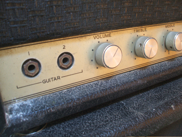 Bright channel with 2 input sockets Volume treble (with pull for bright) mid bass. Then normal channel with 2 input sockets and volume treble bass speed depth red lamp off/ standby/on switch.