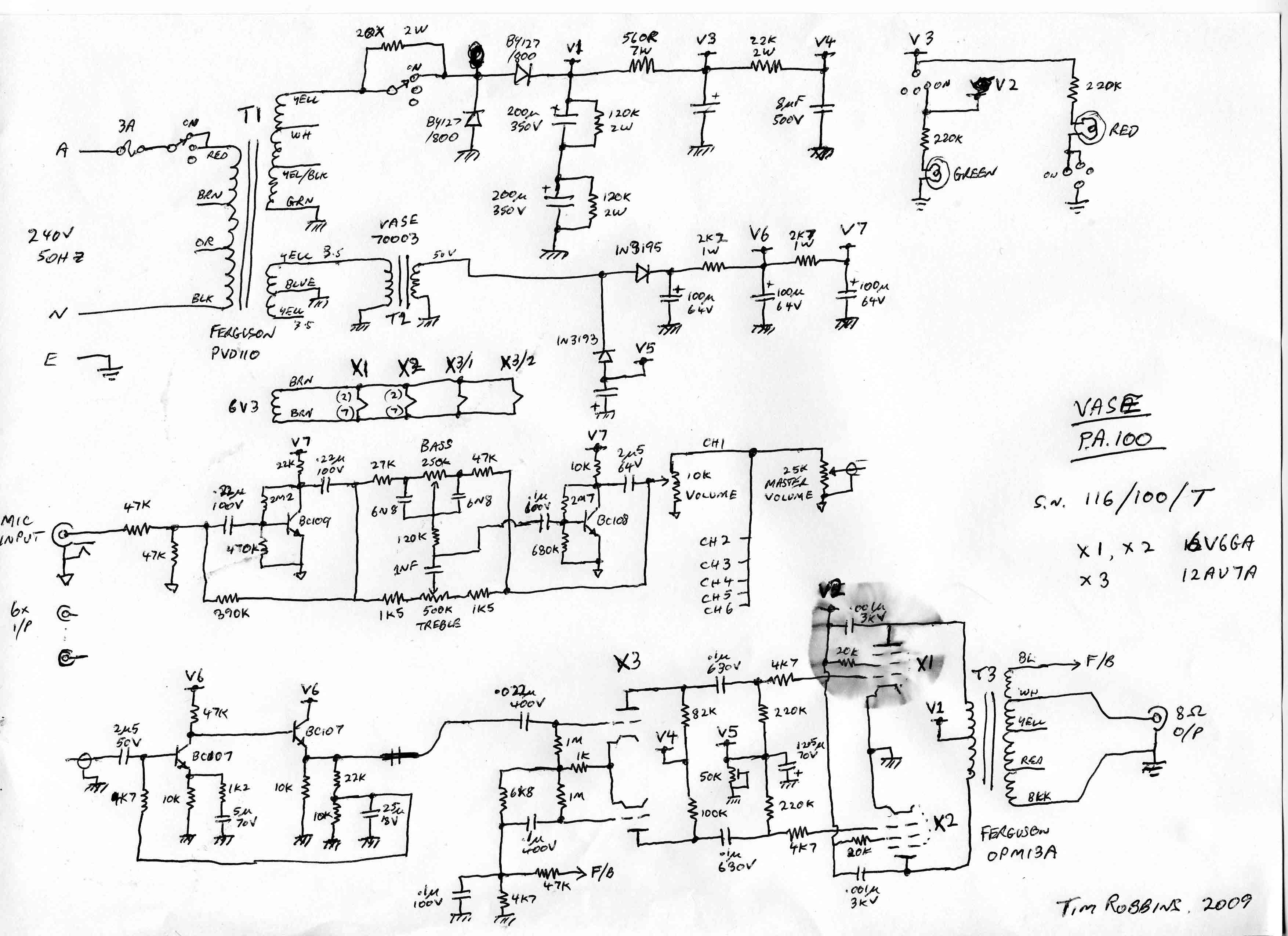 Unsure if 6V6G was original selection. I doubt it, more like KT88's. - rr Also unsure of resistor value for screens (appears to be 20k, but resistors read about 400R), and for on switch bypass on HT rail. Also unsure of transformer secondary configuration, and what appears to be a choke/transformer with marking VASE 70003.