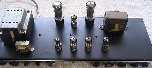 What looks like a pair of KT88's at left, preamp cans,