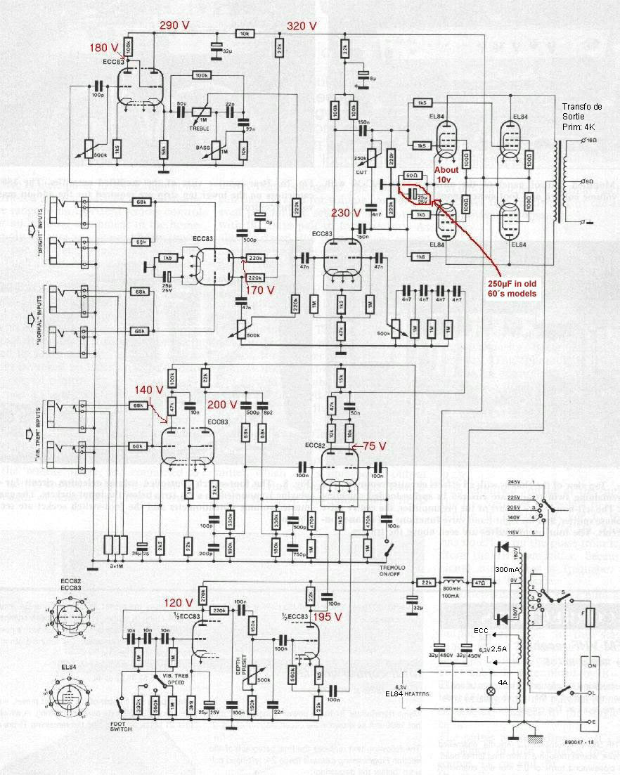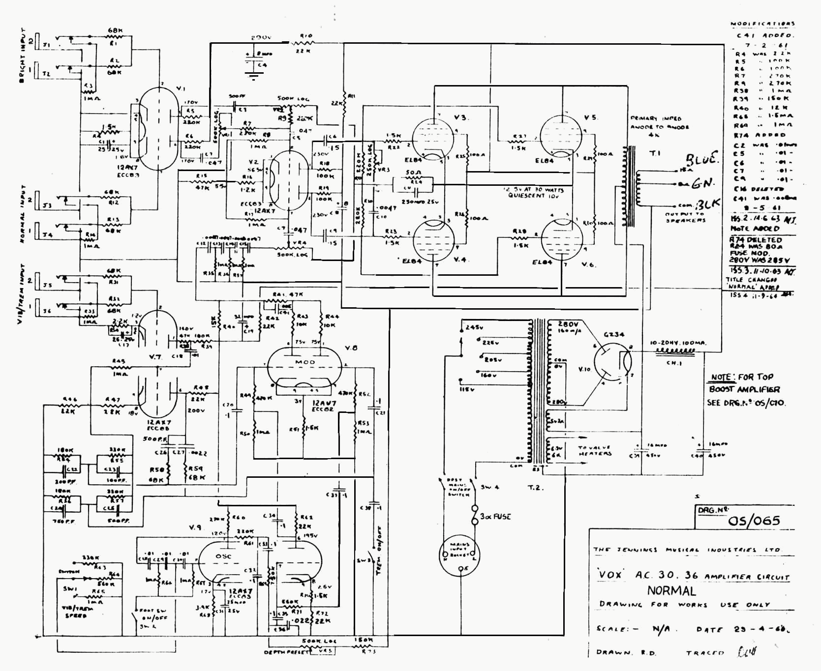 Vox AC30.36 works drawing by “R.D.”, Richard (Dick) Denney.